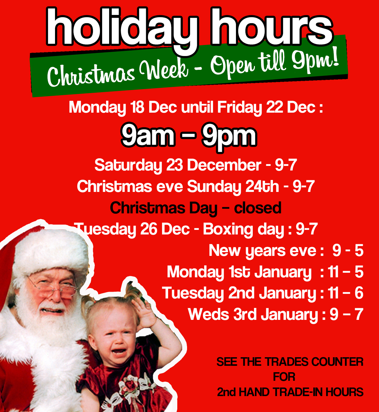 Regular Second Hand trades counter opening hours: *public holidays may differ