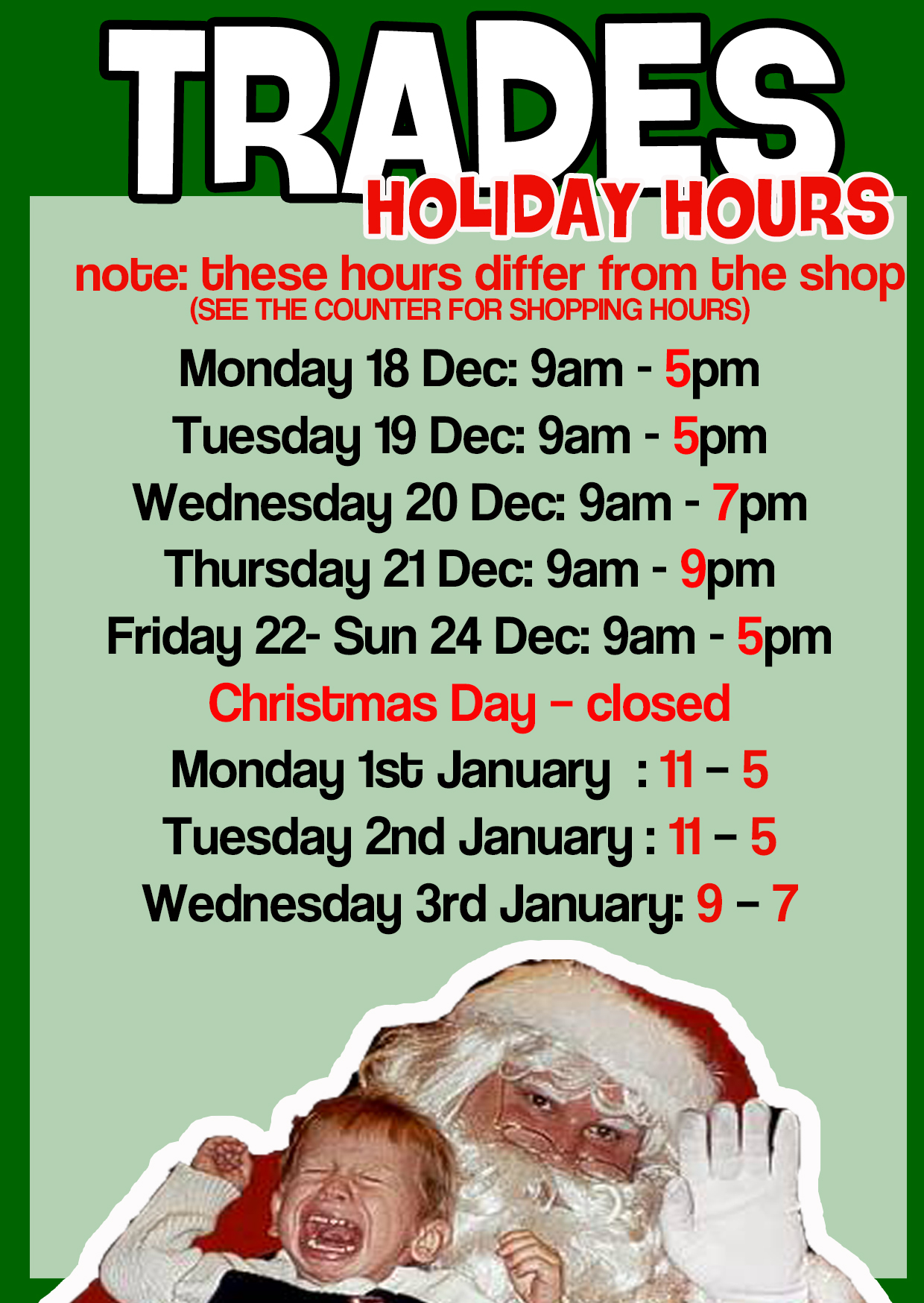 Our hours sometimes change - here are our christmas hours